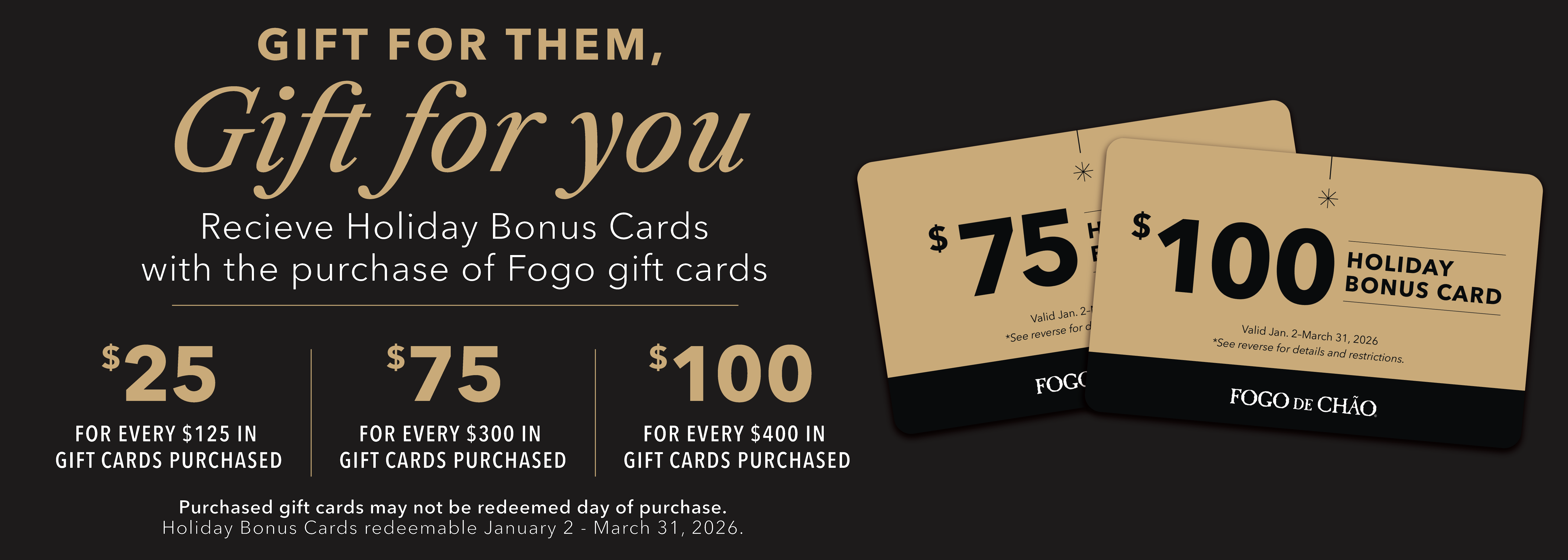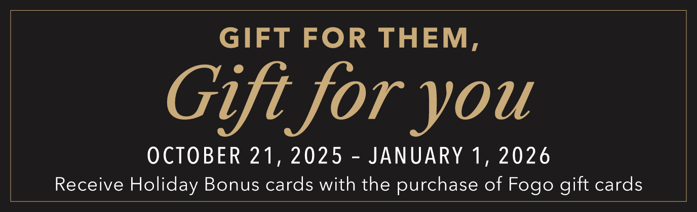 *Promotion valid October 21, 2025 – January 1, 2026. Bonus card redeemable January 2, 2026 – March 31, 2026. Bonus Card is a promotional value card valid for use toward any dine-in meal – cards not valid on catering or to-go orders, and excludes holidays like Valentine’s Day February 14, 2026. Valid redemption is one per table, gift cards may not be redeemed on the day of purchase. Bonus cards not valid on any other promotional offer like Restaurant Week, Fogo Rewards or Best of Brazil cuts.